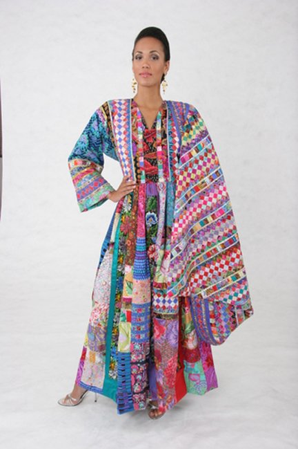 | Design Source - Description | Made for the Bernina Fashion Show. Contains 135 Kaffe Fassett fabrics, iron on crystals, silk dupioni, beaded belts from Guatemala, sequin/beaded trim from India. |