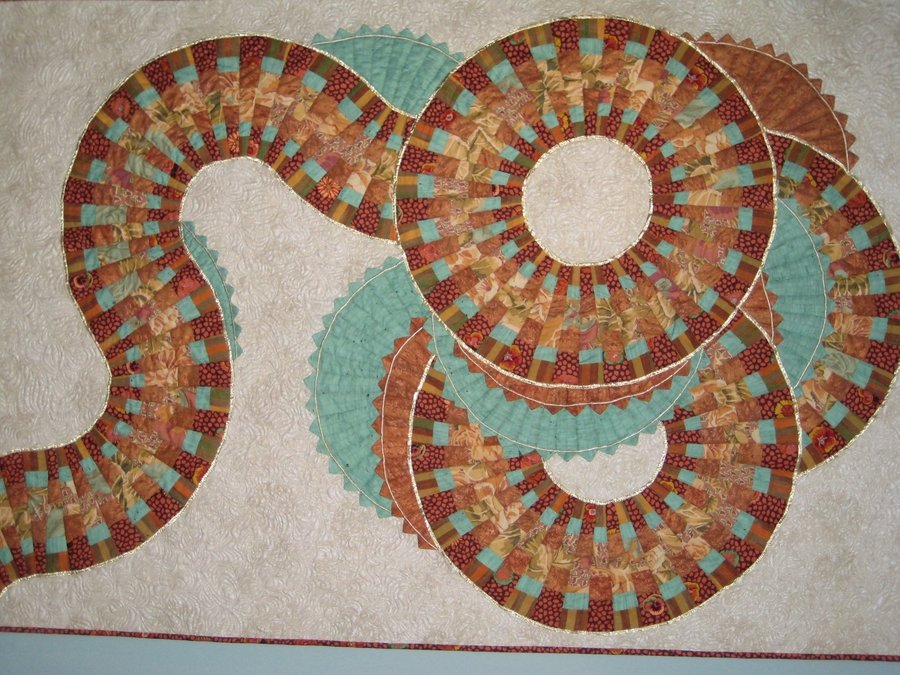 ebsher Esplanade - I took a technique class, using the wedge ruler, from my local quilt shop. In the class I learned to create wedges and turn them in any direction I wanted. After trying many twists and turns, i came upon the one I liked best. It reminded me of a path through a park that I had walked as a child. My mother called that path "The Esplanade" , therefore the name. It was displayed at our guild's exhibit in Homestead and was one of the quilts shown on the flyer to advertise the exhibit. It hangs on the wall in my livingroom. I am very proud of the machine quilting on it as I did it on my home sewing machine.