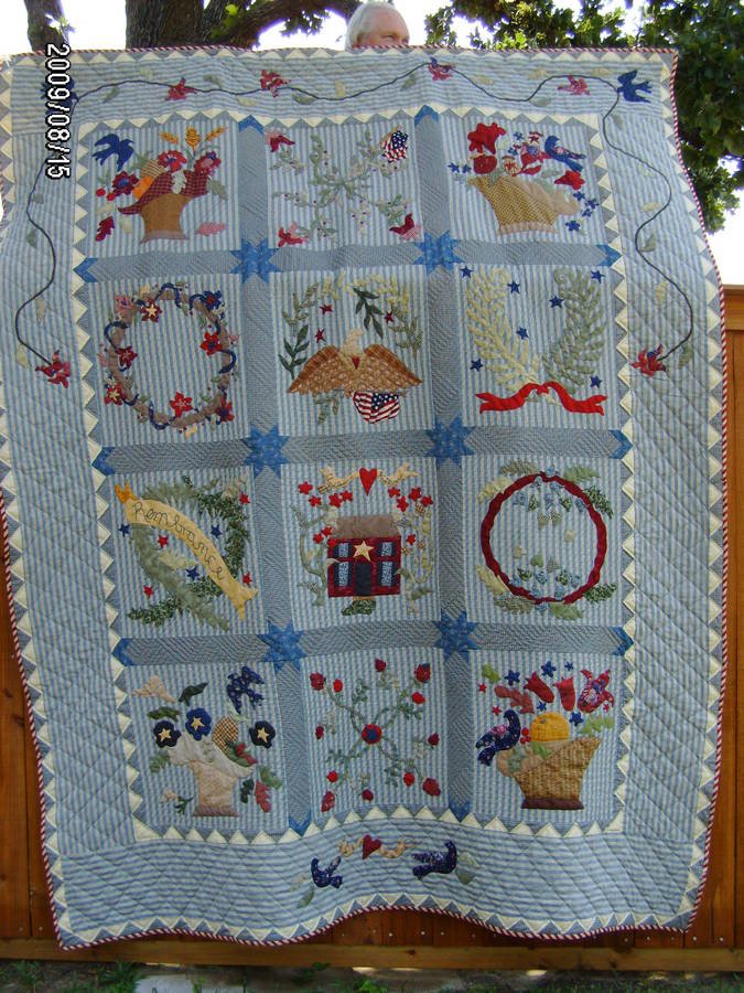| Design Source - Description | Blocks are reproduction block from the Civil War era. The project took me 3 years to get the applique and piecing done and 2 years to hand quilt. So far, of all the quilts I have done, it is my favorite. |