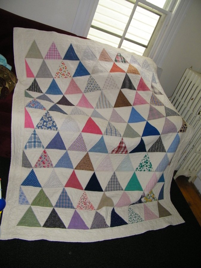 Linnyt Living Stones - I made this quilt from cut pieces I found in an antique shop in Troy, NY The triangles look like equalateral triangles, but they are not (maybe why they never made it to a quilt?0. I made a pattern shape the same as the pieces from unbleached muslin and set the pieces alternating with the muslin. For more inormation, see the blog about it at https://www.quiltersclubofamerica.com/blogs/linyt/archive/2009/10/27/living-stones-piecing-someone-else-s-dream.aspx