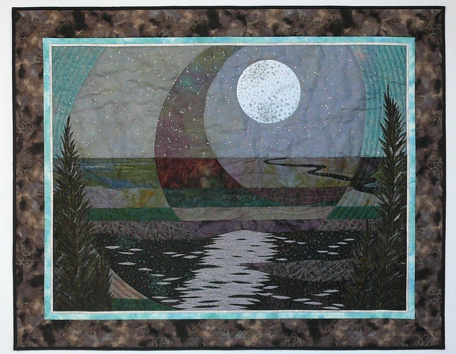 gingerquilts Moon River - This quilt was made for the Piecing Partners Quilt Guild 2007 Challenge. It was made of all cotton fabrics, many hand dyed, for the base and covered with sheer. It was appliqued, painted and machine quilted.