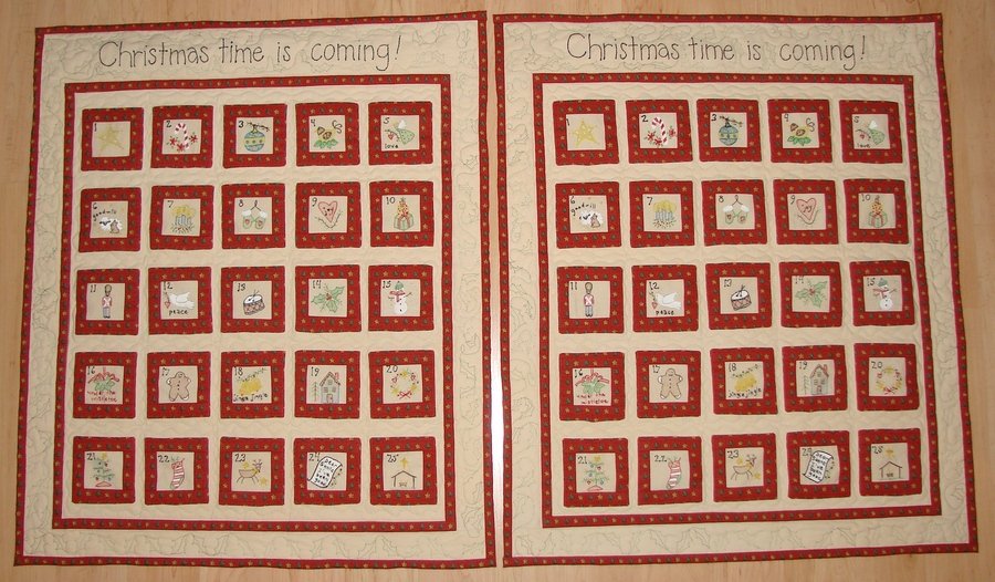 DestinDeb Advent Calendars - I had to make two of these Advent Calendars so each of our children's families could have one. We have 5 grandchildren (3 in one family and 2 in the other) so it was quite a challenge to find gifts small enough to fit 3 in each of the 3"x3" pockets. Since we were shipping them, I had to seal each pocket with darning thread tied at one end so the items would not fall out (it also keeps prying eyes out before the appropriate day). I'm not really into hand embroidery, I had originally intended for these calendars to be ready for Christmas 2008, unfortunately, I didn't get them done until a few days ago - just in time to get them to the kids by December 1st of 2009. They really did turn out cute. What a great pattern - if I ever make another one though, I think I'll do machine embroidery or just print the pictures onto material instead of doing the hand embroidery :).