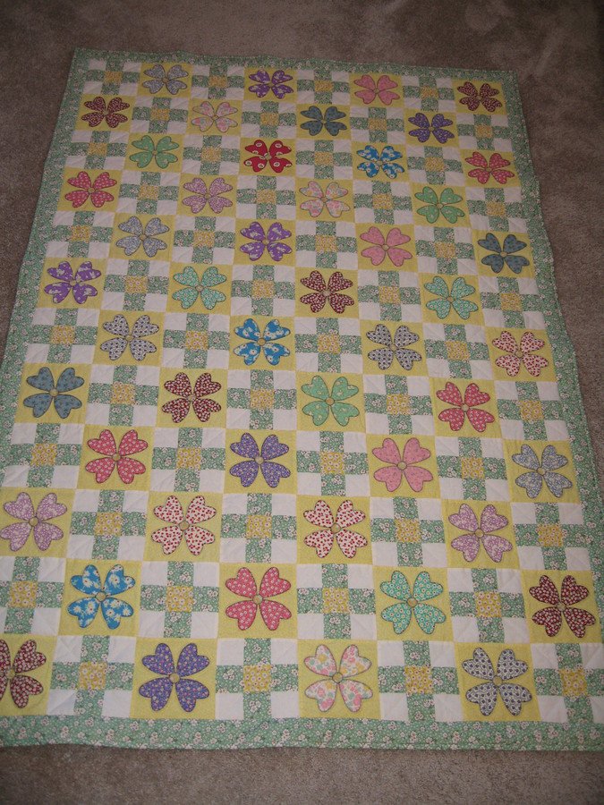 Carlymae Friendship Garden - Pieced and machine appliqued using 1930's reproduction prints and a red print backing.