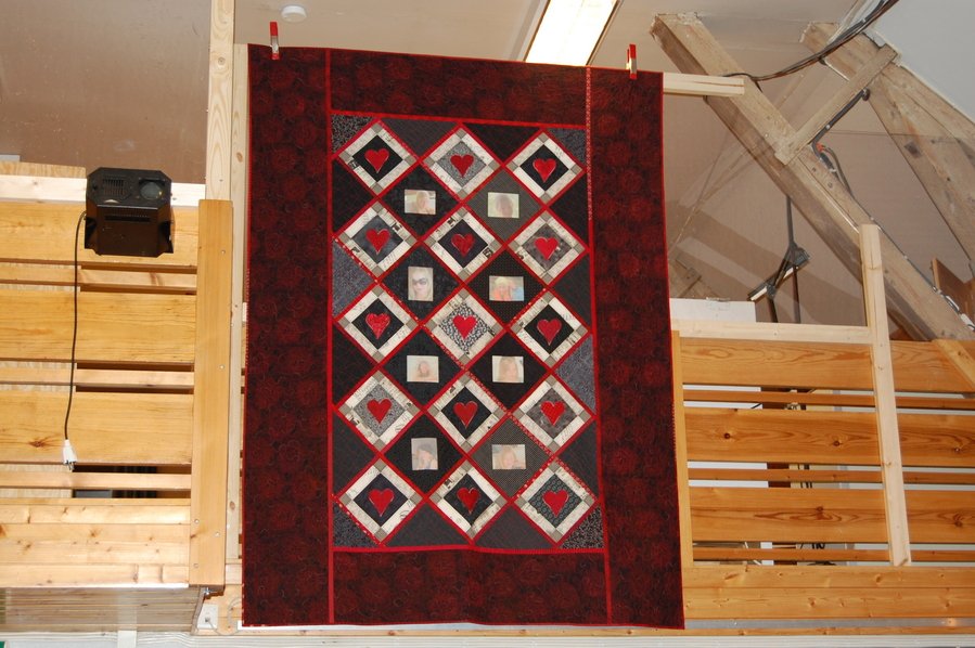 malyn With love to my Vilde - My quild gave us a pattern of an heart to do applique this year. I made some blocks with this heart an started to play a little. I did not know what I whanted it to be . I was also at the same time thinking of making a bedcover for my dauther and suddently this quilt grew from a table quilt to a single bed quilt to my dauther. I used foto transfer on my printer. There are 8 pitcures of Vilde in the quilt. I used "quilt as you go" technique.