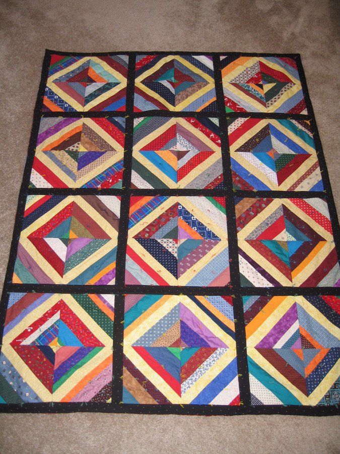 Carlymae Joshua's Quilt of Many Colors - Each block is diagonally strip pieced with dozens of scraps from previously made quilts. The backing is pieced with a variety of fabrics.