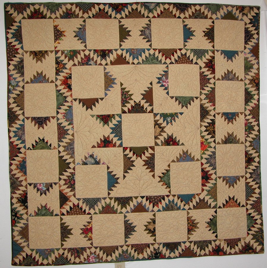 Nance13 Delectable Mountains Star - My first fairly intricate piecing attempt. I learned a lot and gained a lot of confidence by the time this was finished. This quilt is on our bed again this year, now that the weather is cooler. I look at it every night and still feel good about this very early quilt, but I also know what I would do differently if I were to make it again. I guess that is what it is all about....growing and learning!! Made mostly with Jo Morton fabrics. My first attempt at FMQ feathers and wreaths!