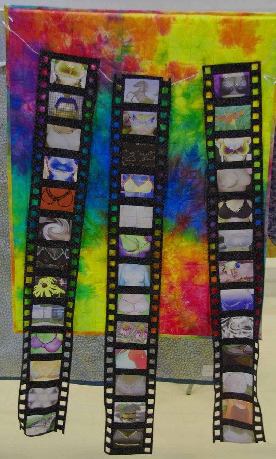 bunny9 Hot Day In July - This piece was created as a tribute to the ladies of QBL (Quilting By the Lake) who gather each summer in Syracuse NY for 2 weeks to explore, challenge & further their knowledge of the quilt form by taking classes from International teachers. Most of the photos were manipulated, & coloured using Photo Shop & then printed onto fabric sheets. Many of the photos were then enhanced with glitter to give them a campy feeling. Timetex was used to form the curl in the filmstrips. The hand dyed background is a beautiful piece of fabric by Judy Robertson.