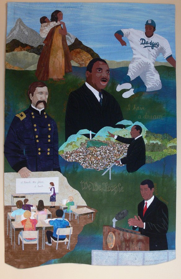SarahAnnSmith Be Inspired, No. 1 - One of six large panels to be made for the local Middle School depicting people and places (made by people) from across time and around the world. This first panel includes ML King Jr, Jackie Robinson, Sacajawea, teachers, J.L. Chamberlain, and Obama.
