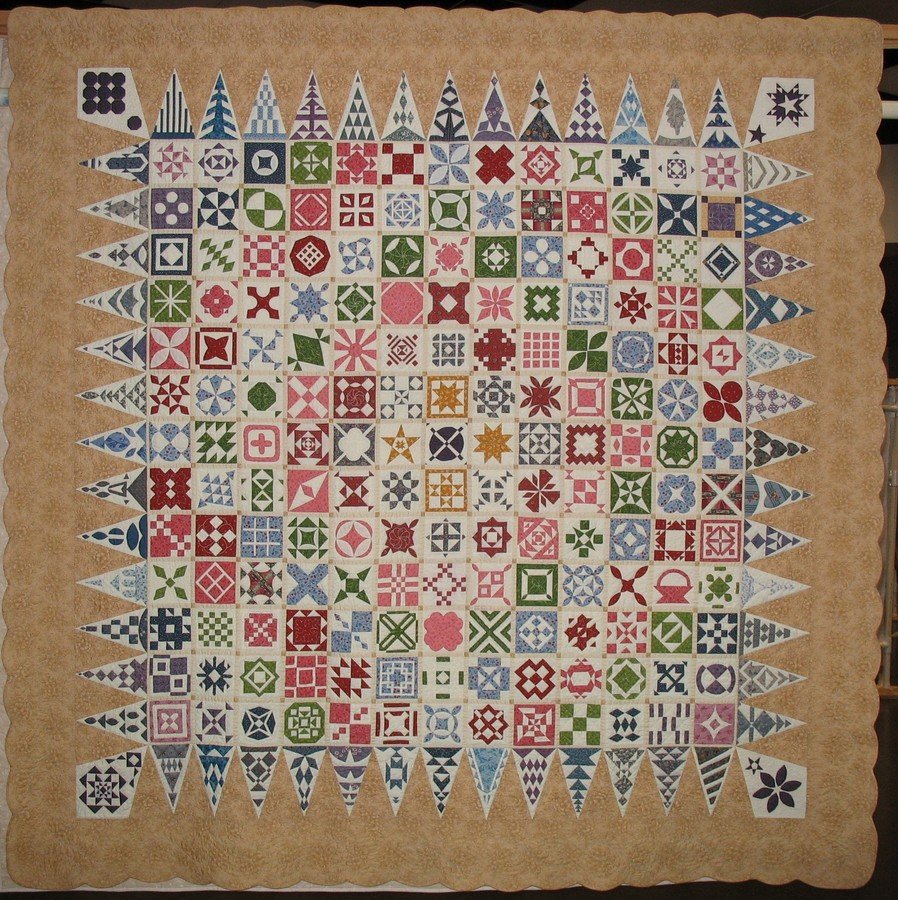 | Design Source - Description | Just a few fabrics were used in this version, unlike many I have seen with different fabrics for each block. The last border was added to make this fit my queen size bed. Wool batting, machine quilted on my Bernina. |
