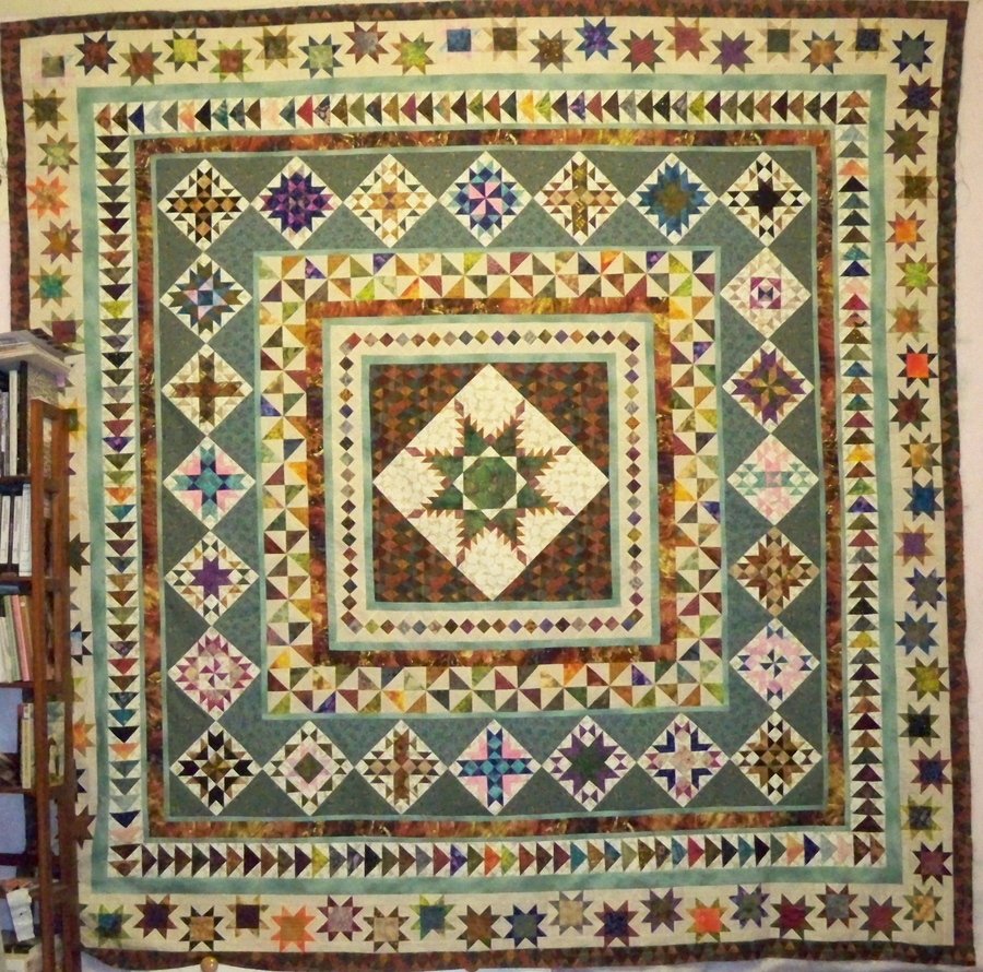 Nerak New Confidence - 2009 BOM "Stars for a New Day" This top has inspired new confidence in my skills and abilities. After my husband of 27 years died quite suddenly in June of 2008, I sort of sank into a walking blank of time. Doing this BOM required that I make color decisions constantly, but the actual paper piecing offered enough structure for me to stagger ahead.