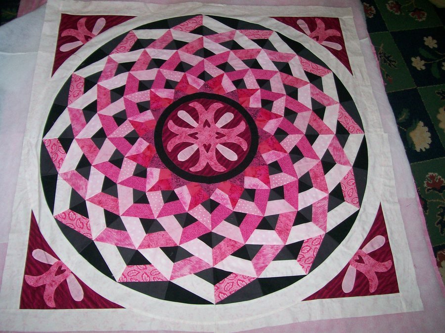 sewwhatwhere mulan rouge - I designed the center and corner appliques. Norah had a class at our guild. She showed us how to design our own motif if we did not like the one on the pattern. I also changed the background by using two tones of background, black and dark gray. This added even more depth. I used pinks from dark to light on one side and pinks from medium to light on the other side. It added even more depth.