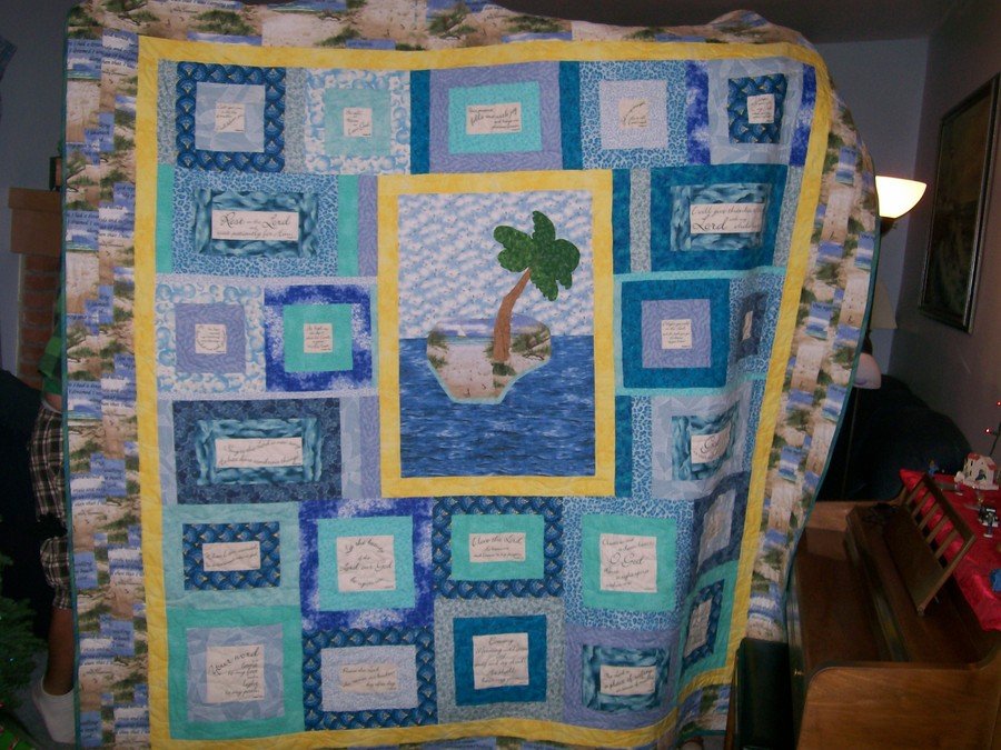 sewwhatwhere Palms for Psalms - Soft edged appliqued center. Psalms fabric purchased at Road to California was bordered by various shades of blue. Golden yellow break borders hint of sunshine and happiness. Footprint in sand sayings create the outer border.