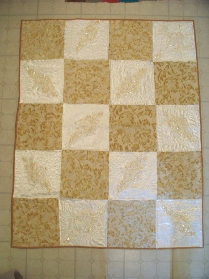 | Design Source - Description | I used 12" squares of my friend's wedding dress, highlighting the lace motifs, and added gold brocade for the complementary squares. I just had fun quilting with different free motion featherish designs. |