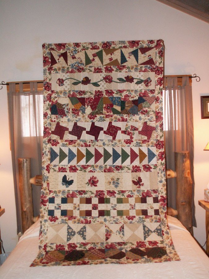 jmprcy Thimbleberries Round Robin Quilt - Nine members of a Thimbleberries Club decided to do a Row Quilt using only Thimbleberry fabrics. The members were Anne Alden, Pat Cashion, Judy Gabrenas, Cathi Gainey, Linda Hartzig, Faye Kelly, Martha Mitchell, Pam Phillips, and Joan Piercy. My row is the third one from the top - crazy quilted blocks.