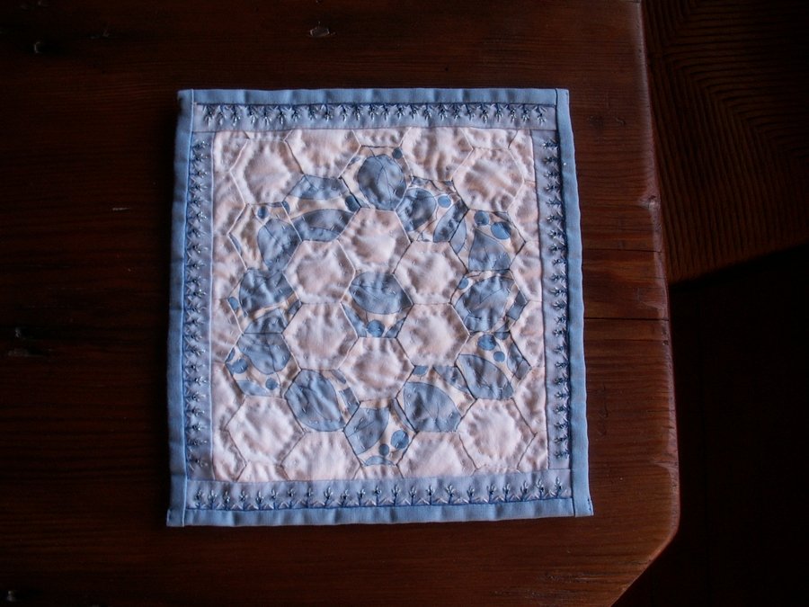 jmprcy Blue Flowers - This miniature quilt was made for my best friend, Linda Jennings. The blue and white hexagons are authentic 1836 fabrics I found at the Metrolina Expo in Charlotte, NC. The beading and embroidery are my own design.
