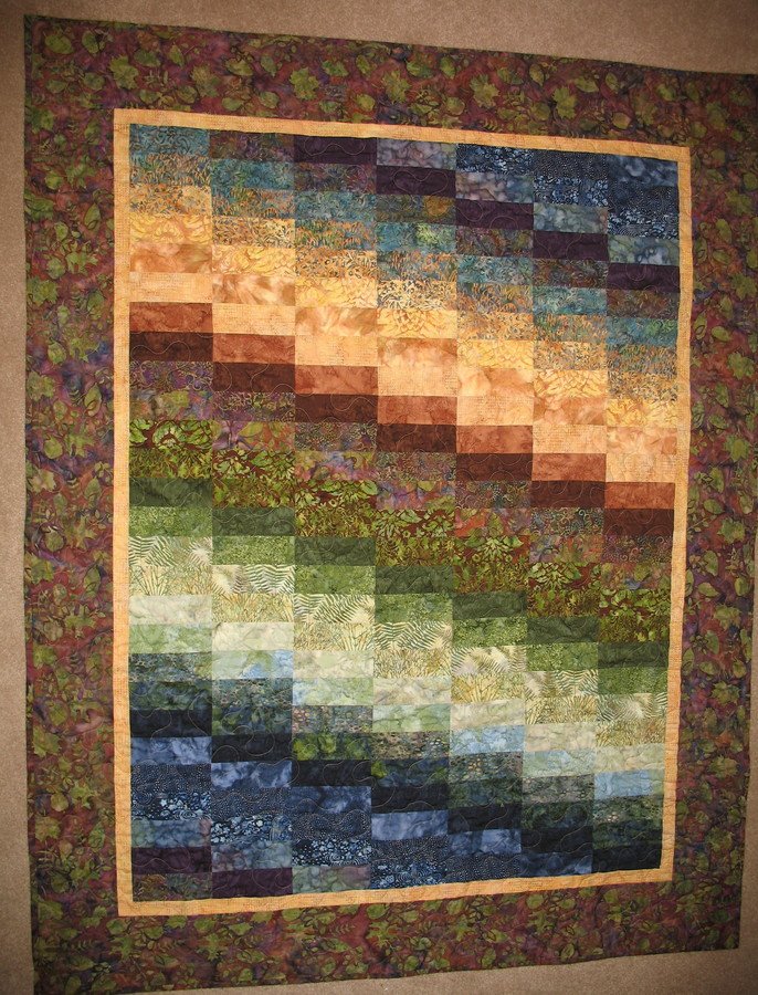 atkinssm Mint Chip for Holly - I love batiks and wanted to use a Bali Pop to make a Christmas gift. I came up with this idea that was fast, fun, and easy to make. If anyone is not familiar with Bali Pops, they are a package of 40 assorted 2 1/2" batik strips by Hoffman. I selected 27 of the strips and arranged them so they shaded from one color to the next and cut 6" segments and sewed them together in a bargello style.