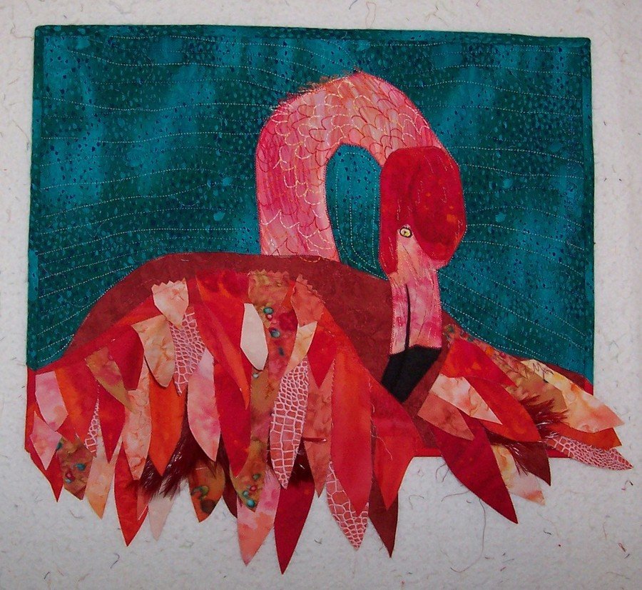 chessiesoul flamingo thought - This piece was done for a Heather Thomas color theory class and was based on thoughts about my family who lives in Florida and in the Bahamas. This piece was a joy to put together as each feather was fused to another fabric and then cut out and piled on in layers. Fake feathers were added in during the layering.