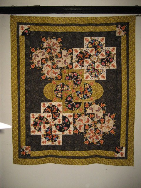ejoy44 Children and Goldfish - I decided to fuzzy cut the drunkard's path with children from the fabric. Placement of these children determined the design. With the additional of an accent fabric also enhanced the design. I like dimension on my quilts, so the goldfish was added was supperimposed over goldfish on the fabric. Beads were also added for dimension.