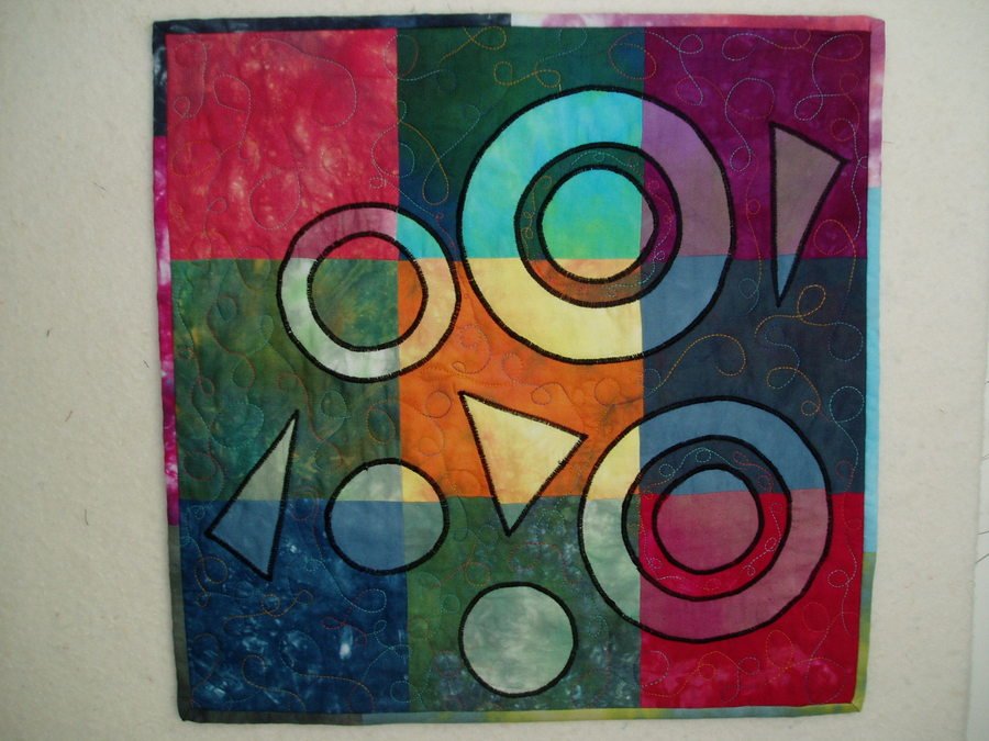 Inspired by the demonstration Libby Lehman gave on TQS of using the circle attachment. I used my hand dyed fabrics and added some triangles too. |
