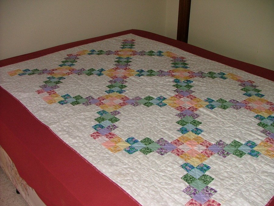 cyclamenjane white love - A basic but lovely Irish Chain quilt with pastel coloured blocks. My first and only attempt at hand quilting. Happy with the result though.