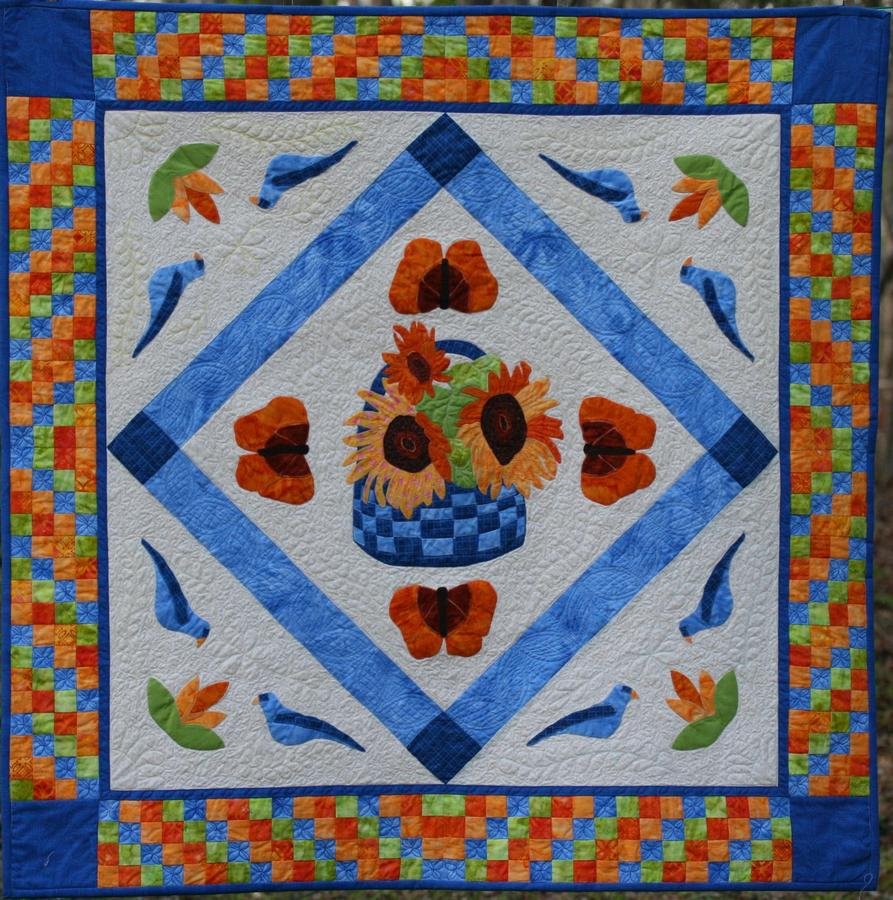 coboring Sunlit Summer Basket - Inspiration for this design came from my Sunflower patch last summer. I saw a beautiful butterfly hardly noticable from a distance. Pattern is Press & Peel fusible applique with a traditional pieced border.