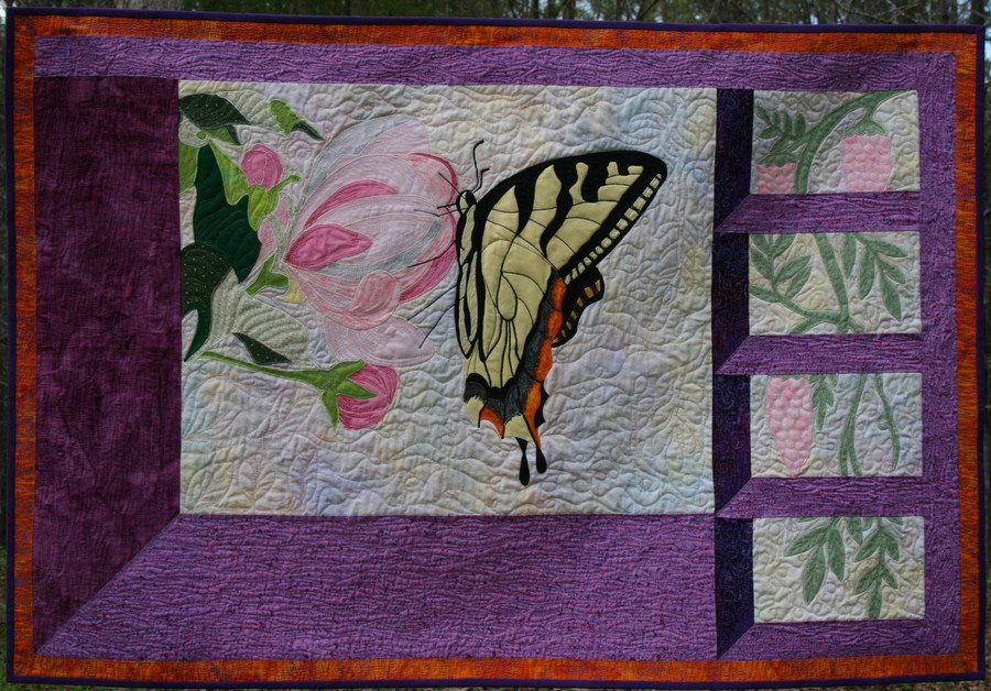 coboring Taste of Spring - This design was inspired by a picture I took last year. It features Press & Peel applique and machine quilting. This one gets a lot of attention at the shop.