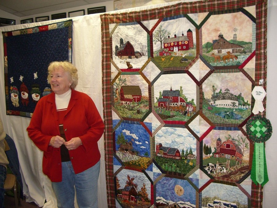 judithannequiltz Country Barns Around the Year - I spent many happy days in the barn on my grandparents farm in River Styx, Ohio. Fell in love with this 2003 calendar quilt from Piecemakers. It took me five years to make the quilt. The barns are well traveled, across the USA twice, Hawaii, Canadian Maritimes and many places inbetween. I batted the quilt at Bend on a picnic table. Bad move. Not flat! I used ultra suede for many of the animals and lots of silk ribbon, special threads and beads. When my daughter saw the little pink ultra suede pigs she fell in love with the quilt and asked if she could have it. Well, maybe some day.