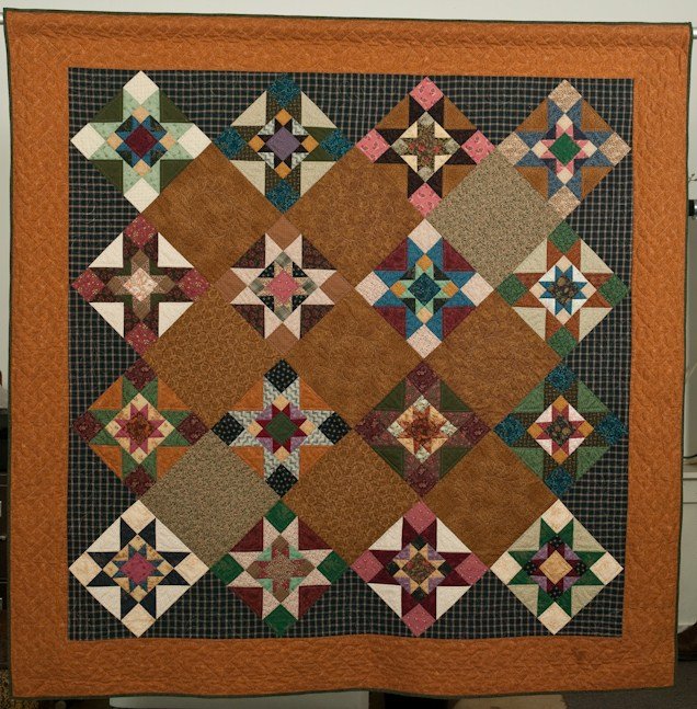 bbquiltmaker Living in the Past - The simplicity of the old-time style quilt called out to me. I save my hand quilting for my favorite quilts and this one certainly qualified. Too bad I chose such busy prints for the large solid blocks--the feathered wreaths I hand quilted hardly show at all.