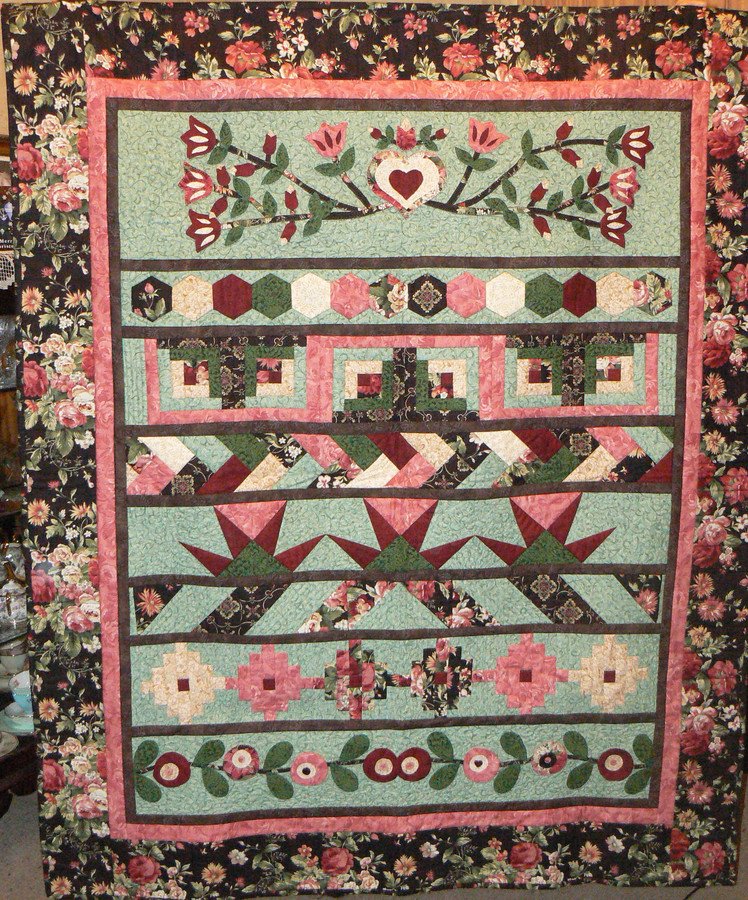 Heather12345 Row-by-Row Sampler Quilt - In my quilting class our teacher gave us this quilt design to do which she had put together herself. Each row consists of a different quilting technique, we received a different row each week to do. It is also a "quilt as you go" using iron on pellon in the center.