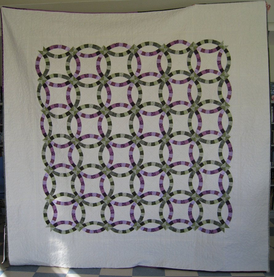 Walknrun Double Wedding Ring - I didn't have enough fabric (the recipient of the quilt selected Eleanor Burns' Yours Truly fabrics from Benartex which is no longer available) to complete all of the required arcs for this size so I used the background material in a 12 inch border in which Amie beautifully quilted feathers and piano keys.