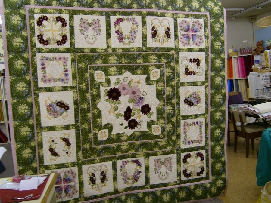 | Design Source - Description | Beyond Color Purple is a machine embroidered Queen Size Quilt with a center medallion surrounded by 16 blocks separated by sashing and finished with a large border. |