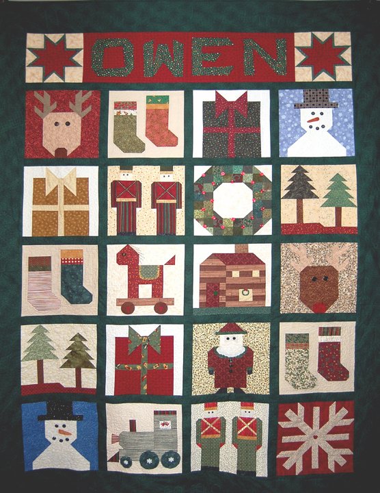 taw1107 Owen's Quilt - I chose different Christmas blocks from Nancy's book and made two Christmas quilts. This one is for my grandson. On the top I paper-pieced Owen's name. All the material is Christmas themed collected over many years. The backing is flannel.