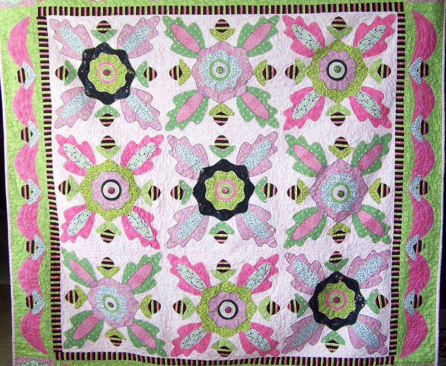DebbieWolf Amber's Garden of Love Quilt - I made this quilt for my granddaughter, Amber. It is raw-edge machine applique. I did change the colors in the original pattern to pinks, greens and blacks to match Amber's room. The backing is lime green Minkee and I did the machine quilting.