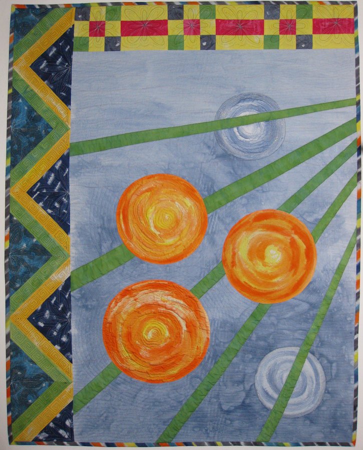 Zarah Future - no 4 in a series of four. It's waiting for quilting. It has taken me 5 years until I could make it. Picture will come, when it's finished. That's what I wrote last year (2009). Now after a lot of struggle it's finally finished. It's the worst quilt of my life. It has been troubling me since the design came up and it never stopped. At a point I was very near to give up and throw it away, but I gave it one more chance and now it's finished. I had it on my wall for 24 hours. A good friend saw it and fell in love with it, so she brought it home and it is now hanging in her clinic. She is a psychotherapist so a lot of people will get to see it there.