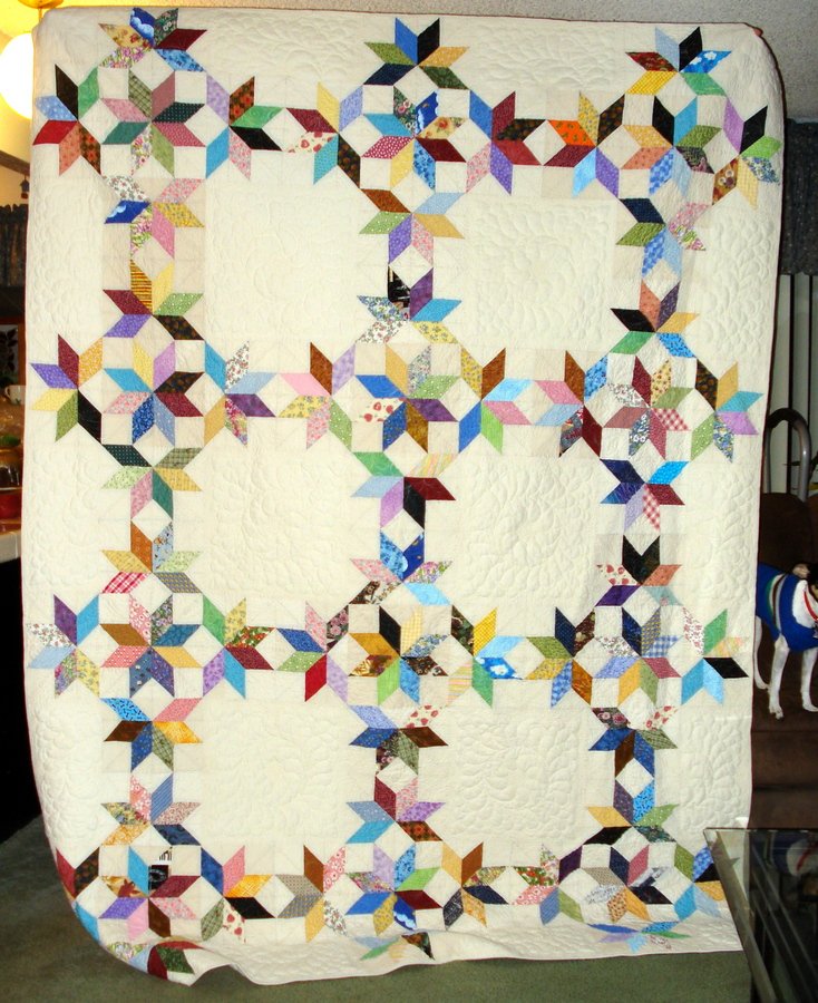 SusieQMcF The Neverending U.F.O. - I saw this quilt on Simply Quilts and started it in (I think) 2003. At that time the "Y" seam was WAY out of my skill level. I switched to a paper-pieced version of the same blocks. This quilt took me years to complete as the paper-pieced version of a lemoyne star is a little bit tedious. Worked out well because there's a bigger variety of scraps when you drag it out over so many years!