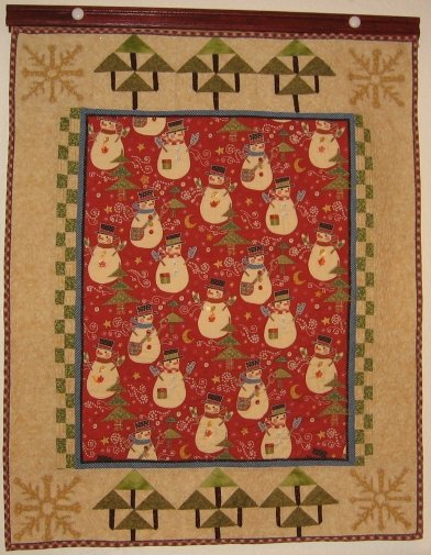 marit Windy, Chilly, Breezy - The snowman panel which is the center of this quilt is Henry fabric of the same name. It is the first quilt that I machine quilted. I designed the borders and corners around the winter theme, and included quilted pine trees in the borders. All of the snowmen and center designs have been machine embroidered with my Janome 6600 machine.