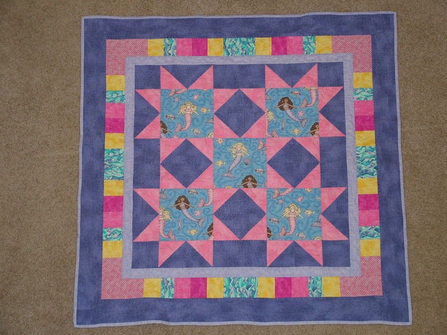 LakeViewQuilter My Little Mermaid - This is a crib size blanket made for my daughter. She has always been a girly-girl and swims like a fish - what better way to combine both than a sparkly pink and purple mermaid quilt. Machine quilted (free-hand) around the quilt, in the plain purple border, are the lyrics to the old time song "By the Beautiful Sea". By the Sea, By the Sea, By the Beautiful Sea, You and Me, You and Me, Oh, How Happy We'll Be.