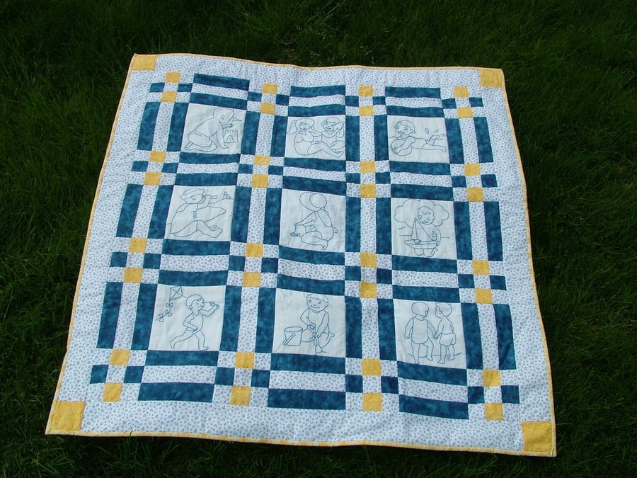 LakeViewQuilter Beach Babies - I had 2 babies, only 10 months apart! The first an exciting and God-blessed adoption, then a surprise pregnancy. (Somebody up there knew these kids needed to be here together!) So it's no wonder I had babies on the brain! Each of the "Redwork" squares was worked in blue thread from a booklet of old style line drawings while I sat, big as a house with one child, while watching the other play on the floor next to me.