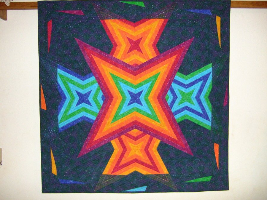cwilczek Jess A Super Nova - My daughter was bored in algebra class and drew this star design. (Don't worry she still made an A.) We put our heads together and duplicated the design in EQ6 to create a paper pieced foundation. I used a fabric selection to follow the color wheel. The background stars are varied to create interest. There are dimensional "vapor trails" surrounding the border. The quilting is done in iridescent thread I got for Christmas from my sister. She gives the best gifts!