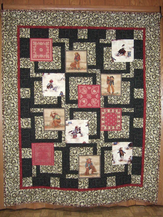 cwilczek The Horse Lady - Machine pieced using pattern adapted from BQ - Maple Island Quilts by Debbie Bowls to accommodate Queen of the Ranch prints. I added fussy cut barrel racer print to complement theme. The dark brown squares in the inner border depict my daughter’s signature brand, THL for The Horse Lady. The quilting is primarily free motion using a Singer Quantum 9940 sewing machine. Red accent border includes barb wire quilting design. Red piping in binding was added for more interest.