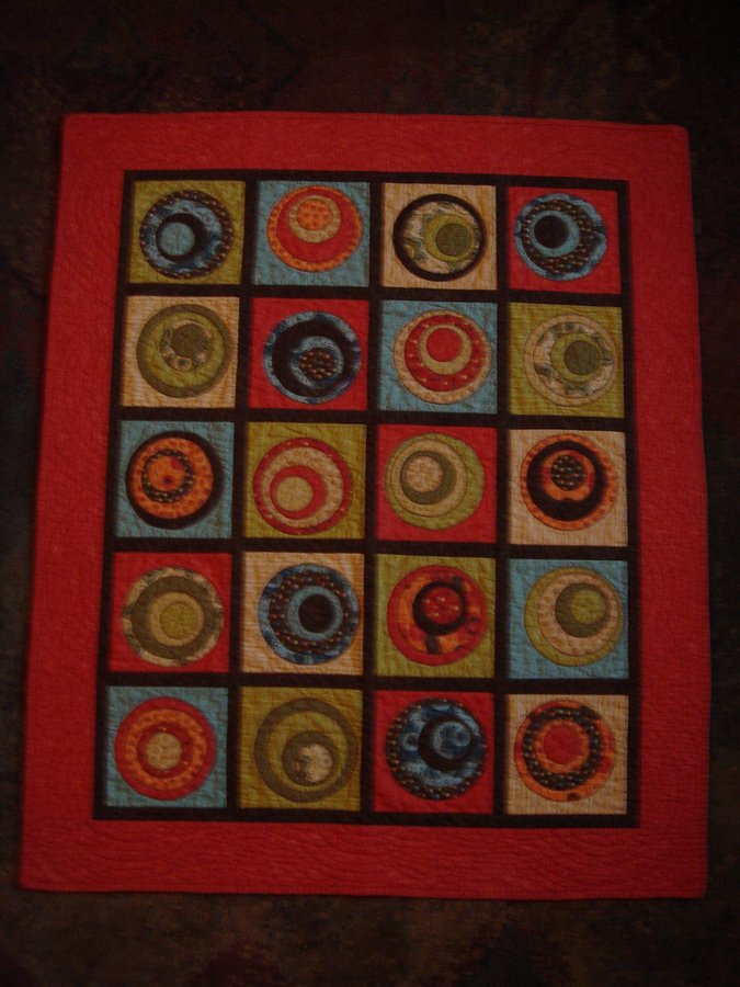 gerbigk Circles for Trey - My daughter picked out the fabrics for her then, baby to be. She did all the cutting and fusing. I did the applique, the other grandma and an aunt to be helped tie threads. Then I finished the rest.