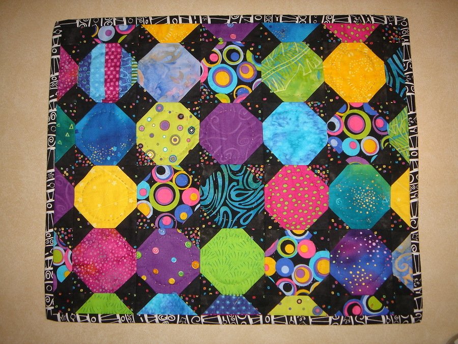 gerbigk My snowballs - Our local quilt group did a challenge with a bright print fabric. We all purchased a yard of the focus fabric. About ten of us each cut a10 inch square of a fabric of our choice for each quilter. We made whatever we wanted, using all the fabrics. We were allowed to add more if we wanted.