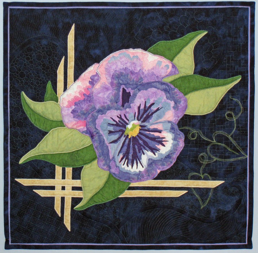 jpotteraz Spring is Here - One of my dimensional flower series using wool batting and faux trapunto to give lots of depth to the flowers. Lots of thread painting and background stippling emphasize the depth of the petals on the flower. Made using upside down applique technique. Grosgrain ribbon is used for the piping in the binding.