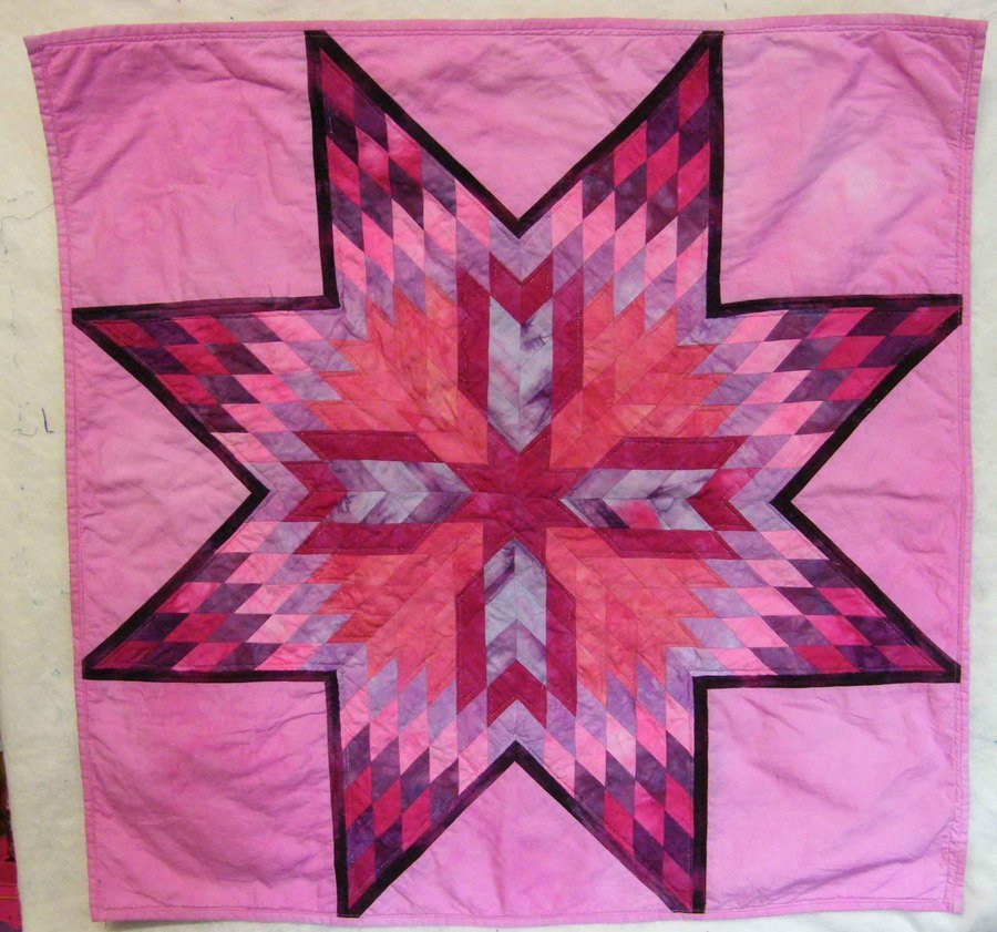 ruth76 Anna's Lone Star - This is a pretty clasisic block (I think) that I arranged to suit what I like. All fabrics are 100% cotton handed by me. It is actually my first attempt at a lone star, there is a sister to this quilt at family members that turned out much neater. If I can ever get my nearly 3 year old to surrender it for a few days I will quilt the corners.