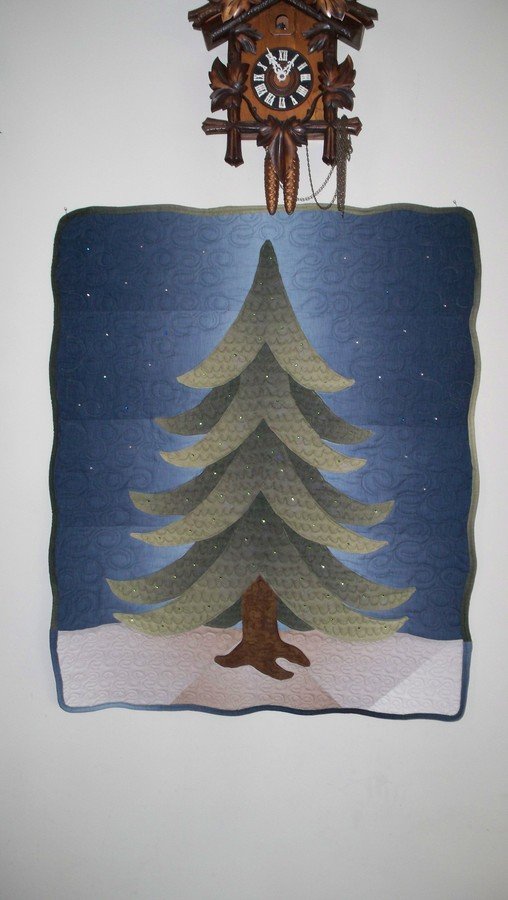 CatieG10 Alpine Wonder - I fell in love with this quilt pattern when I saw a sample at Paw Patch Quilt Shop in Mt. Vernon, Ohio. I bought the kit, the first kit I've ever bought. Usually I want to pick my own fabrics for a pattern, but this is one is special. The ombre (shaded) fabrics used in the quilt create a dimensional effect from the clever piecing instructions that place each section just so. Another first for me is using crystal embellishments. The kit came with a variety of different colors of Swarovski crystals. I made the quilt for my son who is living in Japan and did not have a Christmas tree last year. This year, his apartment is appropriately decorated, and he plans to leave it on the wall all year.