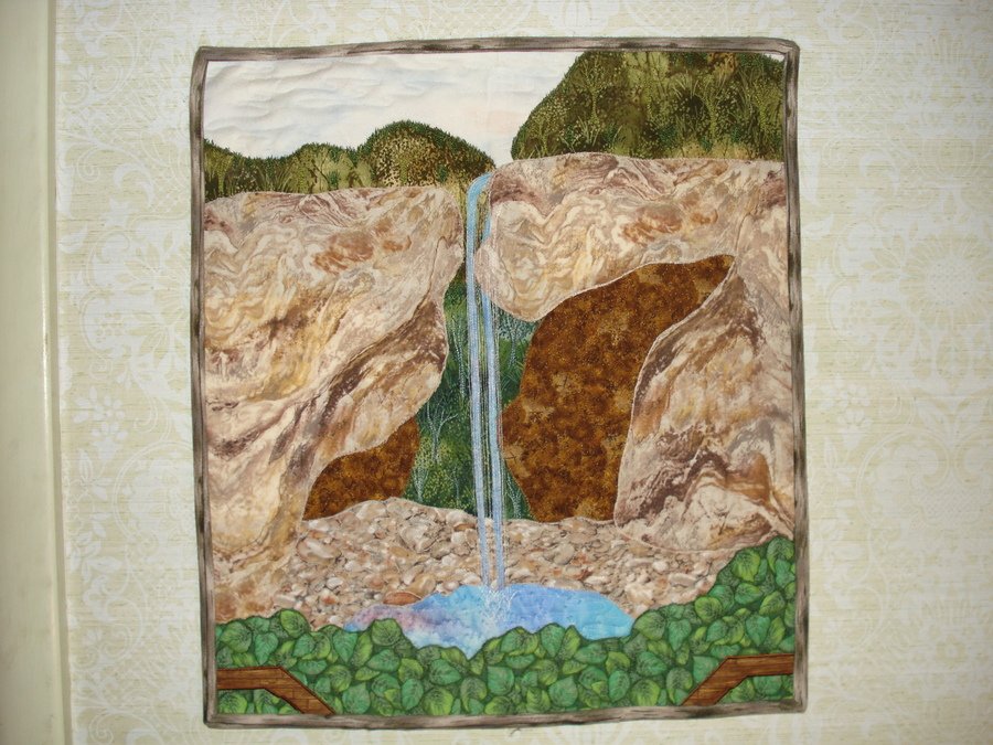 | Design Source - Description | From memory the view from the foot bridge of the waterfall in Ash Cave, my family and I often hike there. Threadwork throughout with an irridescent thread for the water and waterfall. |