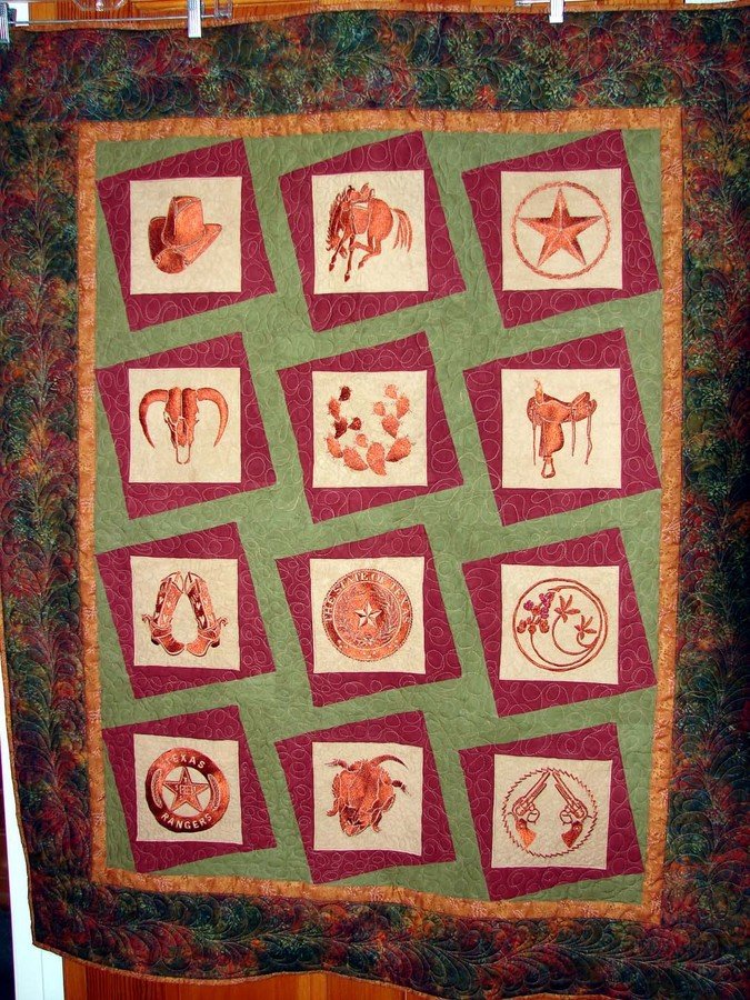 SheronJ Texas Cowboy Crests - This wall hanging consists of 12 machine embroidery designs set in a variation of log cabin blocks. Both the digitized designs and the block settings were designed by Susa Glenn of Fredericksburg, TX