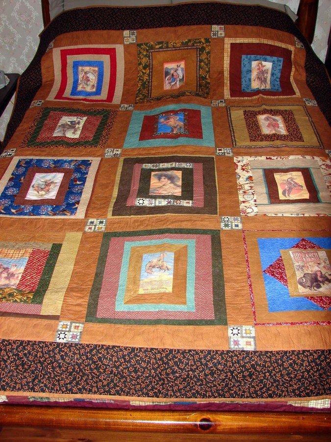 SheronJ You Go Cowgirl! - The images are enlarged, vintage post-cards transferred to fabric sheets. I used western theme fabrics to create the "frames" for the images. It was my first attempt at machine quilting so there are a few mistakes. I used mono filament thread....never again!