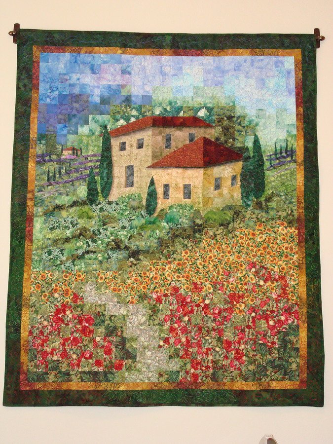 vistahermosa Tuscan Countryside - Houses are from photos taken on trip to Italy. The sunflower & red floral fabrics I had in my stash dictated what would surround my houses. I originally wanted to create a water front quilt but, decided to use my floral fabrics which resulted in a country scene. Some textile paints were used for shading. Applique shapes are fused then stitched with monofilament thread.
