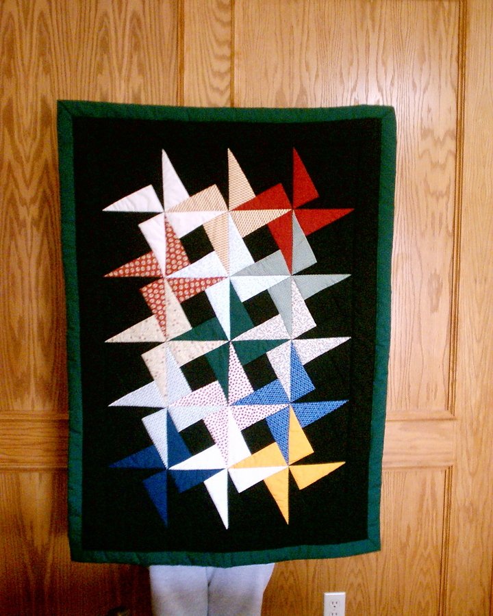 | Design Source - Description | Interlocking pinwheels of various colors on a black background with a green boarder. |